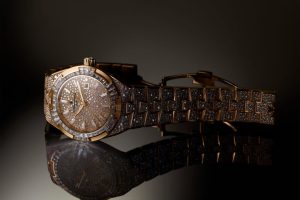 Благодаря невидимой закрепке камни как будто парят над поверхностью металла. При этом каркас из золотых направляющих, которыми камни закреплены на часах, практически полностью скрыт под этим драгоценным «ковром». Крошечная V-образная канавка, вырезанная в бриллианте, позволяет вставить его в направляющие, гарантируя плотное прилегание камня без зазоров и видимого металла.