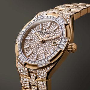 Первая модель Overseas с корпусом 35 мм была представлена в 2023 году. Как и другие модели из этой линейки, ее отличала особая форма безеля, конструкция которого напоминает символ Vacheron Constantin – Мальтийский крест. Здесь он инкрустирован 60 бриллиантами багетной огранки.